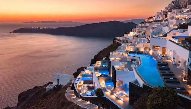 หนึ่งในจุดหมายปลายทางที่นักท่องเที่ยวทั่วโลกต่างต้องไปเช็คอินให้ได้สักครั้งในชีวิต ซานโตรินีถือเป็นเกาะที่สวยที่สุดในประเทศกรีซ และได้ขึ้นชื่อว่าเป็นที่ชมวิวพระอาทิตย์ตกที่สวยที่สุดโลกอีกด้วย เอกลักษณ์ของเกาะนี้คือ การผสมผสานกันระหว่างความสวยงามของธรรมชาติท่องทะเล และสถาปัตยกรรม ที่เป็นอาคารสีขาว รูปทรงแปลกตาที่ตั้งลดหลั่นกันตามเชิงเขาสูงชัน และโบสถ์ที่มียอดโดมสีน้ำเงิน ที่ให้ความรู้สึกสวยงาม โรแมนติกสุดๆ เรียกได้ว่าเป็นมนเสน่ห์ที่ดึงดูดให้ผู้คนจากทั่วโลกเดินทางมาสัมผัส
