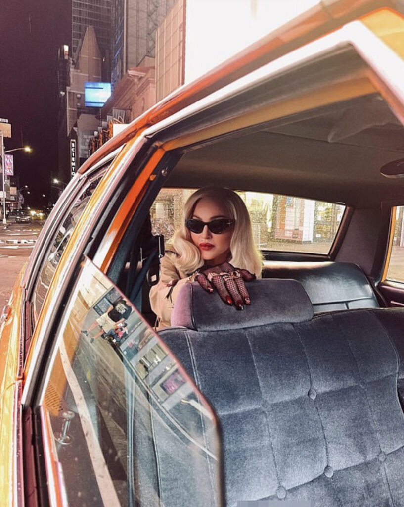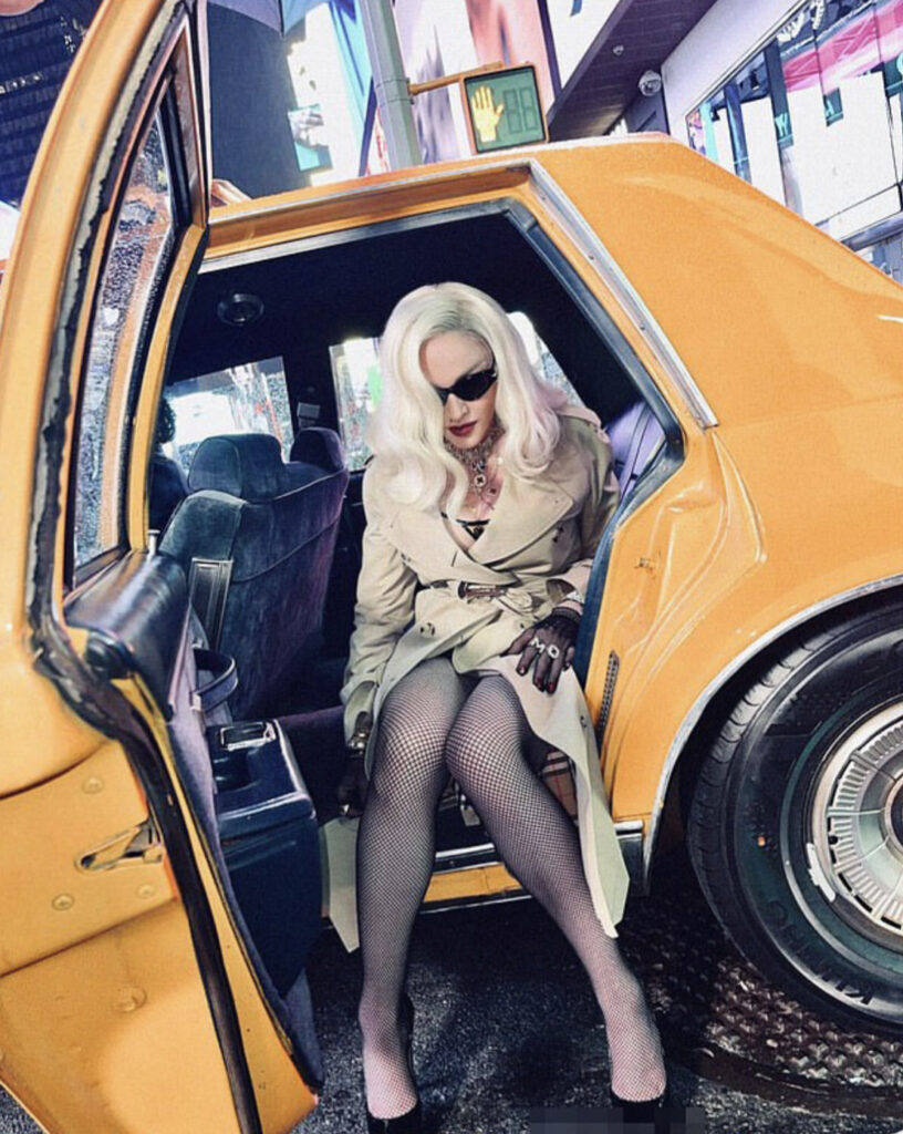 การแสดงเปิดตัวด้วยตัวอย่างภาพยนตร์คอนเสิร์ตของ Madame X ของมาดอนน่า ที่เธอกำลังนั่งรถแท็กซี่ผ่านไทม์สแควร์ในชุดเสื้อโค้ทกันฝนนี้