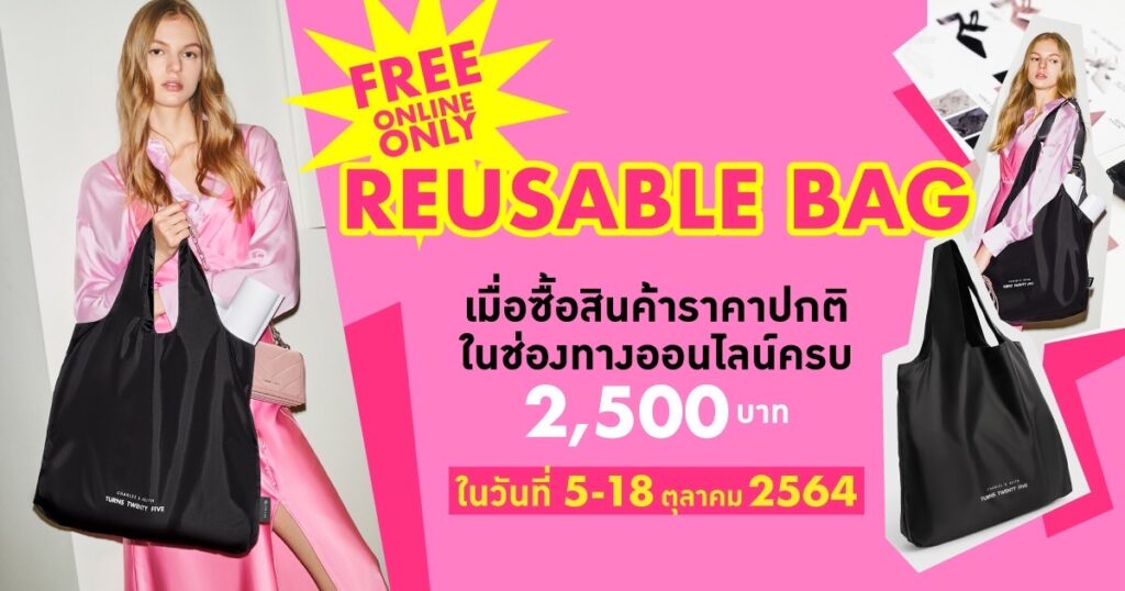 พิเศษ! ช้อปสินค้าราคาปกติช่องทางออนไลน์ในช่วง 5-18 ตุลาคมนี้ ครบ 2,500 บาท รับ Tote Reusable Bag สีดำไปเลย สอบถามรายละเอียดเพิ่มเติมได้ทาง https://www.charleskeith.co.th/