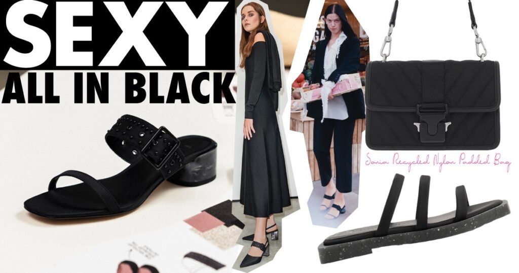 เราหยิบทุกชิ้นที่เป็นสีดำมาแมตช์กันได้ทั้งหมดเลย อย่างกระเป๋าสะพายรุ่น Sonia Recycled Nylon Padded Bag คู่กับเดรสเก๋ๆ สักตัว หรือเสื้อผ้าสองชิ้นที่มีสีเบสิคอย่างขาวหรือดำ ลุควันนี้เน้นเท่เอาอยู่ แล้วแมตช์กับรองเท้าแต่ละรุ่น Sepphe Recycled Nylon Grommet Slingback Pump เข้าพรีเซนต์งาน, Sepphe Recycled Nylon Grommet Mules ประชุมกับเจ้านาย หรือ Arabella Recycled Nylon Slide Sandals ไปเดท ไปเดินเล่น ถ่ายรูปกับเพื่อน
