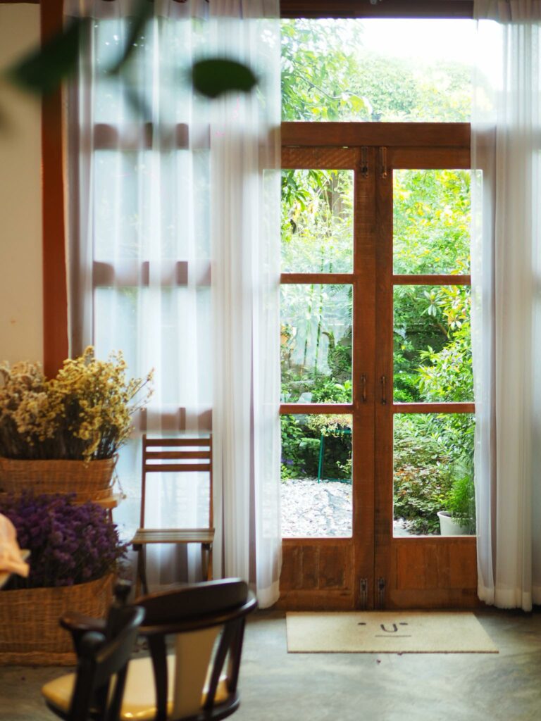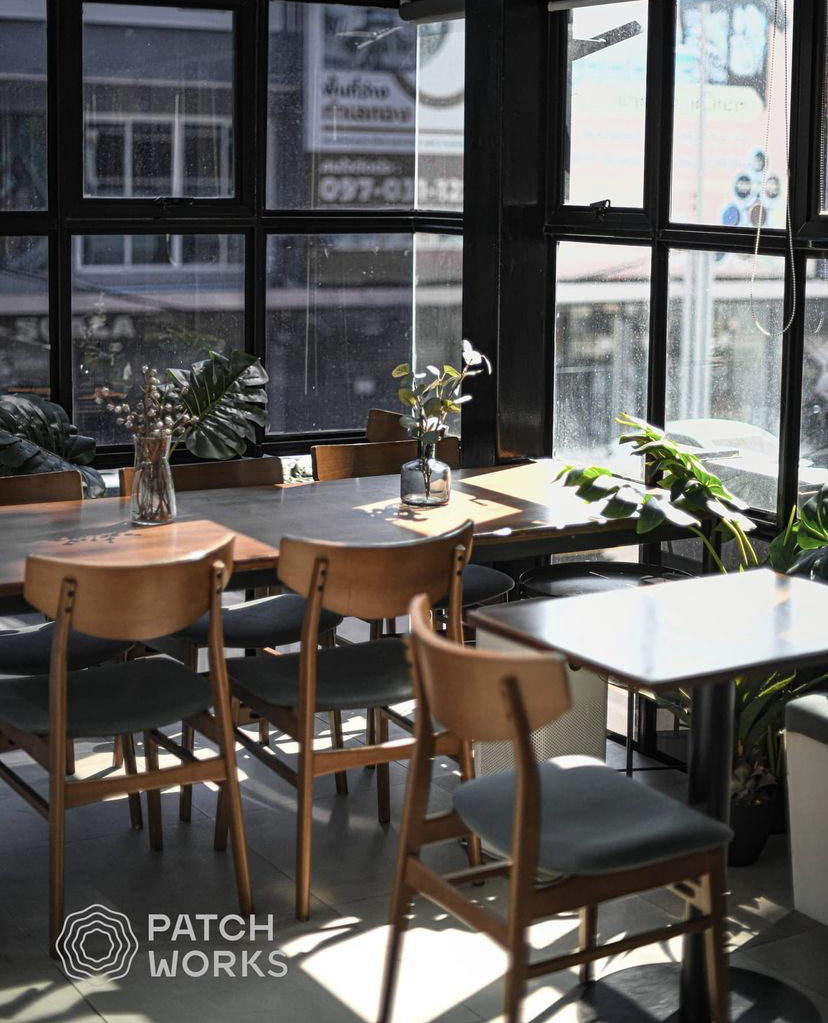 อีกหนึ่งคาเฟ่ที่เป็นเหมือนบ้านเลย คือมีทางเดินเข้าไปสู่ประตู ผ่านแมกไม้เข้าไปในตัวบ้าน ภายในจัดเอาไว้ไม่แออัด ไม่ได้เน้นจำนวน เน้นการจัดสรรพื้นที่ให้ไม่ดูแต่ละโต๊ะเบียดกันจนเกินไป ถูกใจเรามากๆ รู้สึกเหมือนนั่งอยู่ในบ้านในฝัน มีทั้งพื้นที่ข้างในและรับลมข้างนอก