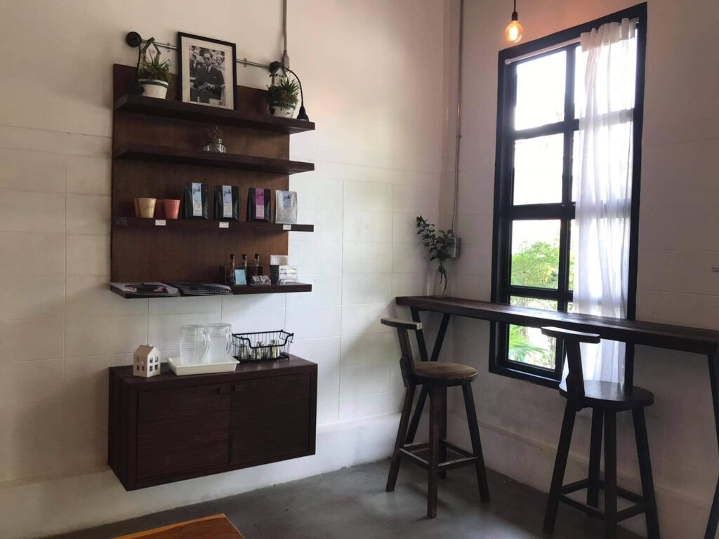 เขาคงไม่ได้ตั้งใจจะซ่อนร้านเอาไว้หลังกำแพง แต่ถ้าเดินผ่านๆ ไม่ตั้งใจอาจจะไม่รู้ว่าร้านอยู่ตรงนี้ ในวันร้านเปิดประตูที่ฝังอยู่กับกำแพงก็จะเปิดออกให้คนเดินเข้าสู่สวนส่วนตัวเล็กๆ กันได้ พื้นที่ในร้านไม่ได้ใหญ่มาก แต่กว้างพอจะให้ถ่ายรูปเล่นและนั่งสบายๆ รับลม มีโต๊ะที่ด้านนอก ชานไม้หน้าร้าน และเก้าอี้ประมาณ 8 ตัวในร้านริมกระจกและเคาน์เตอร์ เหมือนแวะมาเติมพลังแล้วก็ไปต่อ